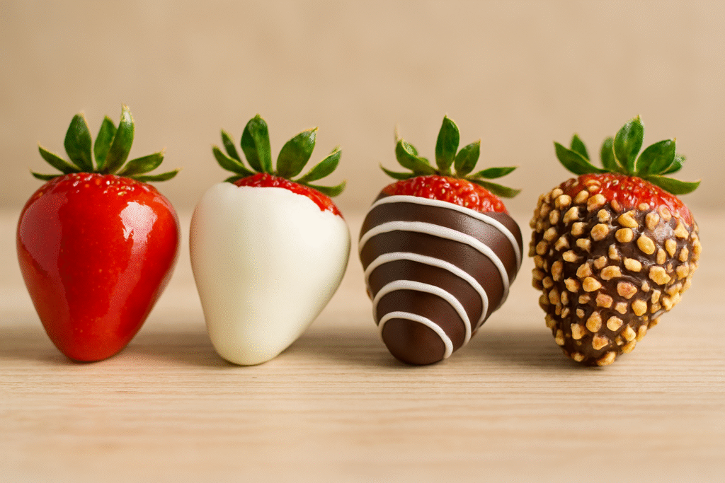 - Morango com cobertura dupla: base de chocolate amargo + camada de chocolate branco sobreposta.
